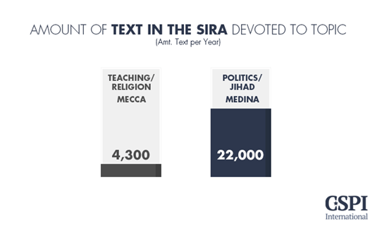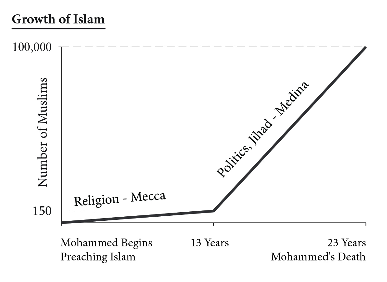 • „Als Mohammed während der ersten Phase des Islams in Mekka nur der Prediger einer Religion war, wuchs der Islam um etwa 10 neue Muslime pro Jahr. Dann, in Medina, als sich Mohammed dem Dschihad verschrieb, konvertierten durchschnittlich 10.000 Menschen pro Jahr zum Islam.