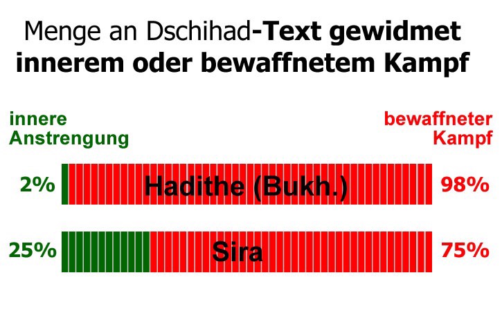 • Mit dem größeren Dschihad ist die geistige oder innere Anstrengung gemeint, aber nur 2 % der Bukhari Hadithen [1] und 25% der Sira sind dieser Art des Dschihads gewidmet.