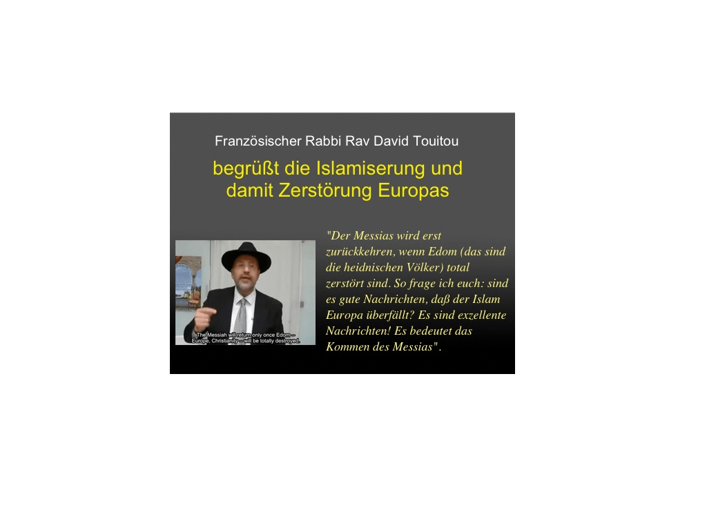 Der Dschihad forderte während der letzten 1400 Jahre etwa 270 Millionen Tote unter den Nicht-Muslimen. Die von Juden eingesetzte politische Gewalt kostete seit den Tagen des Alten Testaments dagegen etwa (geschätzte) 300.000 Menschen das Leben. Wie man sieht, hat der Dschihad tausendmal mehr Menschenleben gefordert als die politisch motivierte Gewalt, die von den Juden ausging.“