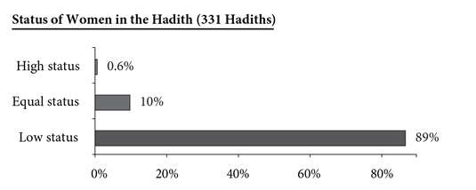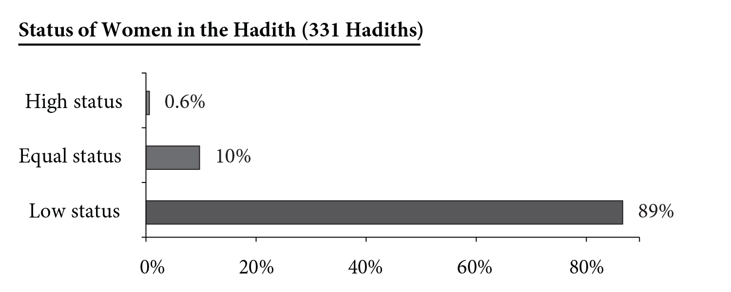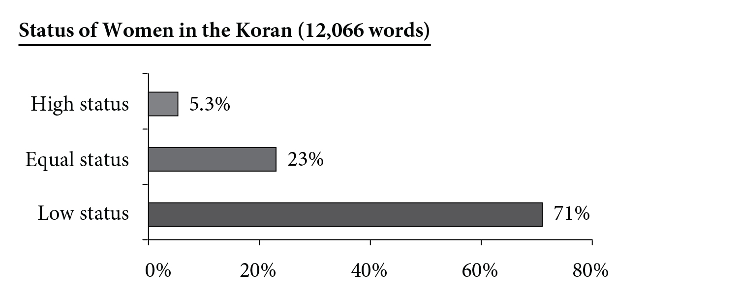 (Koran 71%, Hadithen 89% des Textes): Der größte Teil der islamischen Lehre spricht den Frauen einen minderwertigeren Stellenwert als Männern zu. Dazu zählen die Verteilung von Erbe, Aussagen in einem Gericht, Intelligenz und religiöse Freiheiten. Bezüge auf besondere Regeln, die - im Vergleich zu Männern - die allgemeine Freiheit von Frauen einschränken, sind dieser Kategorie ebenfalls inbegriffen.“