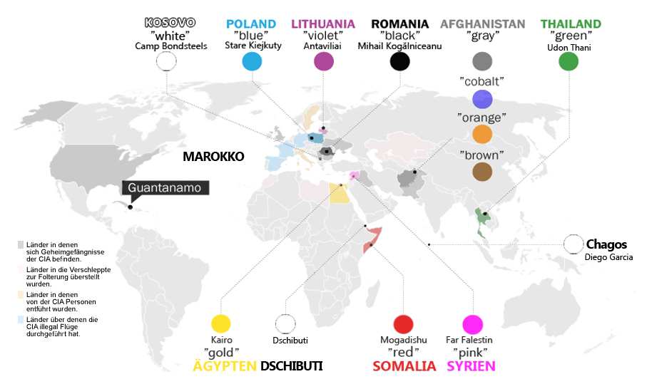 - „Zur Verschleierung der Folter richtete die CIA klandestine Geheimgefängnisse, „Black Sites“, in Ländern wie Afghanistan, Thailand, Rumänien, Polen oder Litauen ein..“ Wikipedia