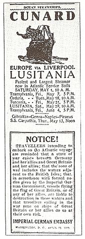 Als das deutsche U-Boot U-20 am 7. Mai 1915 das amerikanische Luxus-Passagierschiff RMS Lusitania der britischen Reederei Cunard Line vor Irland torpedierte und versenkte, starben etwa 1.200 Reisende, darunter 128 Amerikaner. Vor der Versenkung hatte die deutsche Botschaft in Washington eine Warnung veröffentlicht, aber viele Zeitungen in den USA weigerten sich, die Warnung abzudrucken oder zu bestätigen, dass auf dem Schiff auch Munition transportiert werde: