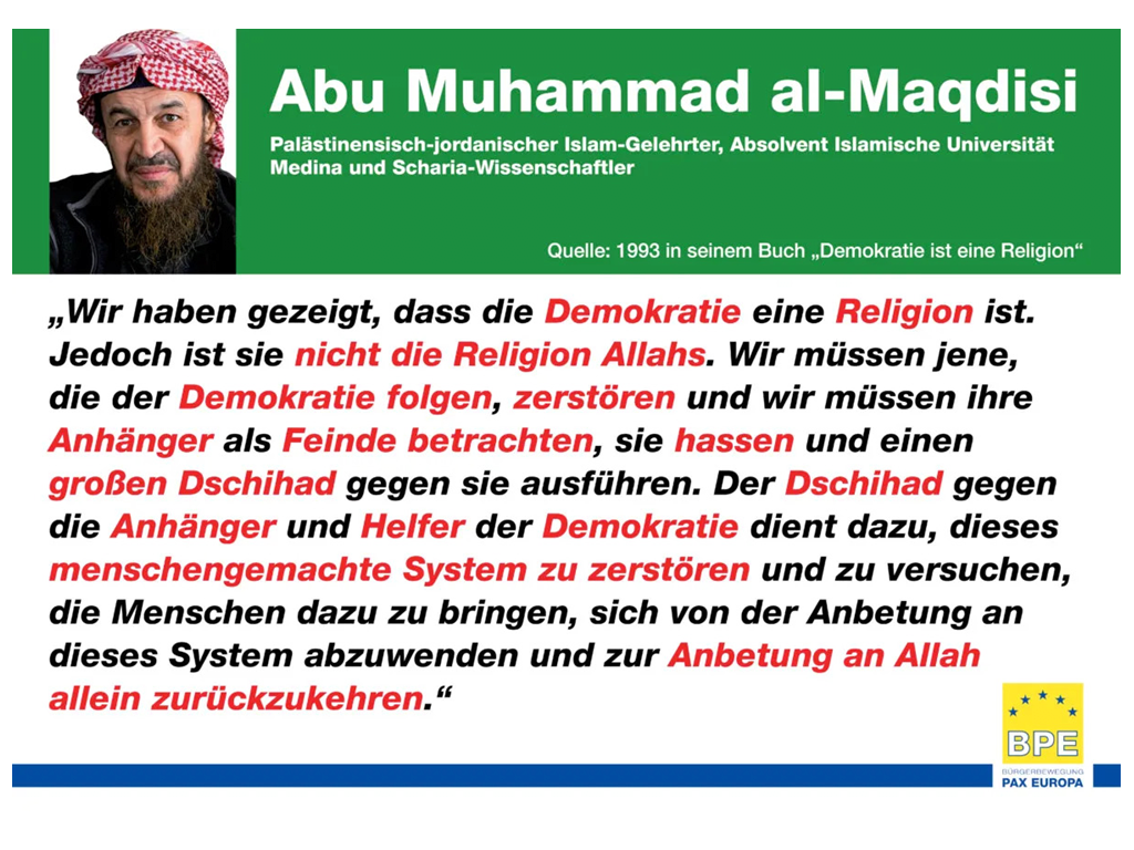 Zitat ganz ausklappen, erfahren Sie mehr... Verkürzten Text anzeigen„Man muss wissen dass, nach der Liebe zu Allah und Seinem Gesandten, Allah uns dazu verpflichtet, [...] diejenigen zu hassen, die sich Allah und Seinem Gesandten entgegenstellen.