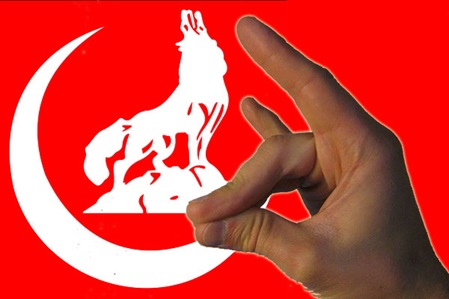 Erkennungszeichen der Grauen Wölfe hinter einer Hand, die den Wolfsgruß zeigtHartmut Krauss, Sozial- und Erziehungswissenschaftler: