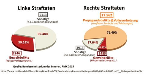 Was nämlich so gut wie immer unterschlagen wird, ist Folgendes: Rechte begehen jene Straftaten, welche die Linken gar nicht begehen können - nämlich die der Meinungsäußerungen, welche den Großteil der rechten Verbrechen ausmachen. Wie sieht das im Detail aus: