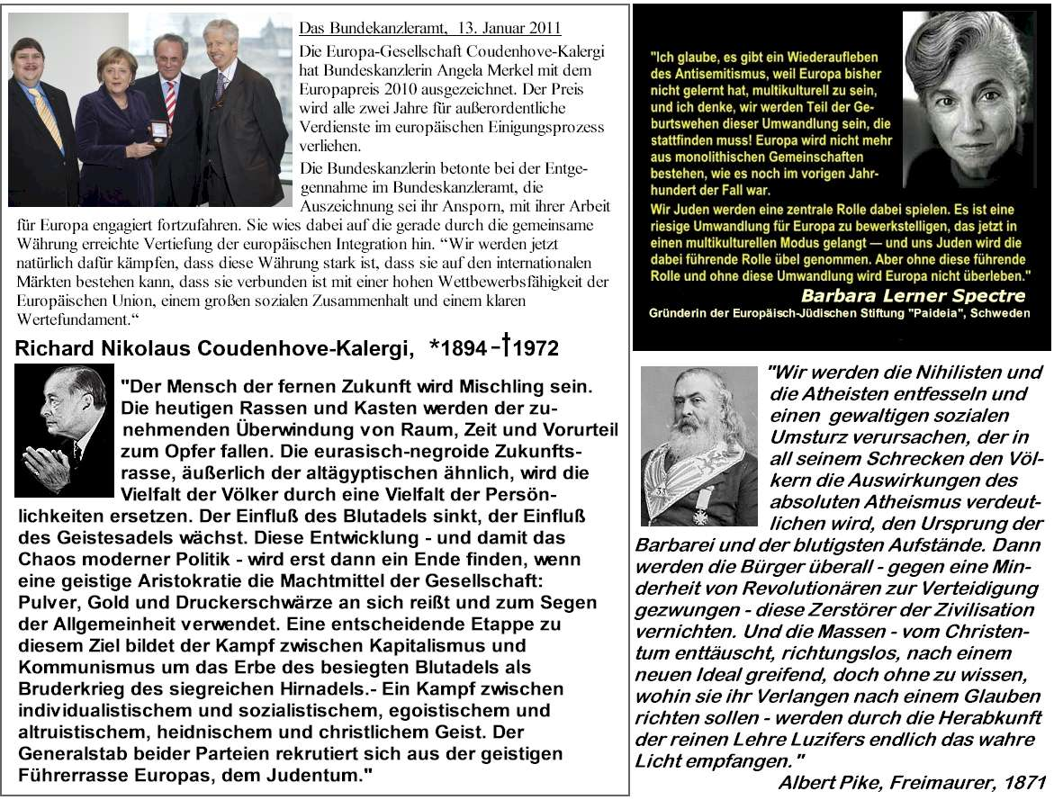 Max Warburg, einer der bedeutendsten Bankiers, Politikberater und Netzwerker, später im Rat der Götter der IG Farben, dem größten Konzernkartell der Welt nach dessen Kooperationpartner Standard Oil, zahlte Coudenhove-Kalergi (Freimaurer) 60.000 Goldmark „zur Ankurbelung der Bewegung“. Sohn Eric M. Warburg gründete die Atlantikbrücke, in der die Europapreisträgerin der Europa Gesellschaft Coudenhove-Kalergi Angela Merke,l Mitglied ist. (Bruder Paul Warburg war Hauptinitiator der US-Zentralbank FED, das private Bankenkartell und Gründer und 1. Chef des CFR)