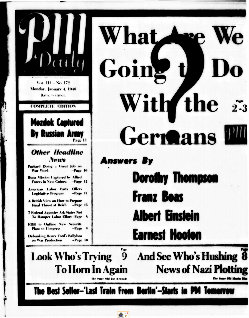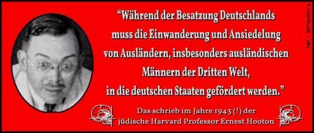 Noch deutlicher hat es der amerikanische Anthropologie-Professor der Harvard-Universität, Earnest A. Hooton, ausgesprochen, als er am 4. Januar 1943 in der New Yorker Zeitung PM unter dem Titel 'Sollen wir die Deutschen töten?' folgendes vorschlug: 'Während der Besatzungszeit soll die Einwanderung und Ansiedlung von Nicht-Deutschen, insbesondere von Männern, in den deutschen Staaten gefördert werden'.“ — Dr. O. Mueller, FAZ vom 14.2.1992