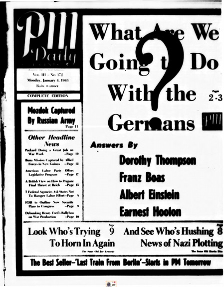 Peabody Magazine, New York, Beitrag: "Breed war strain out of Germans" („Züchtet die kriegerischen Erbanlagen der Deutschen weg“) 04.01.1943