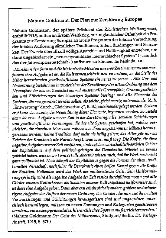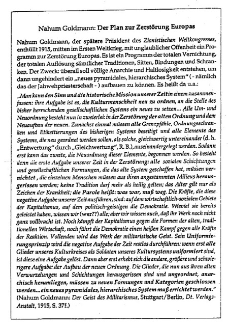 - „Der Generalstab beider Parteien [Kapitalismus und Kommunismus] rekrutiert sich aus der geistigen Führerrasse Europas: dem Judentum.“ ebenda, S. 33