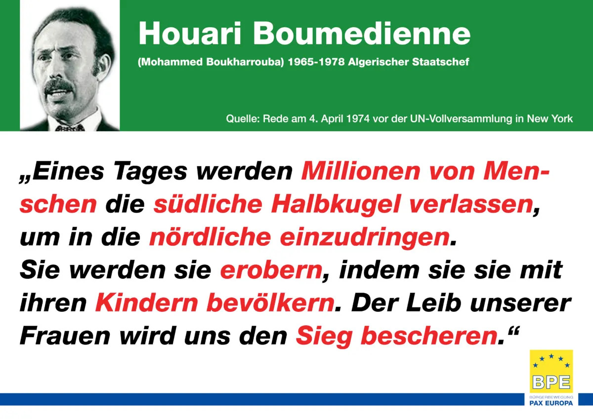 „Eines Tages werden Millionen Menschen die südliche Hemisphäre verlassen, um in der nördlichen Hemisphäre einzufallen. Und gewiss nicht als Freunde. Denn sie werden als Eroberer kommen. Und sie werden sie erobern, indem sie sie mit ihren Kindern bevölkern. Der Bauch unserer Frauen wird uns den Sieg schenken“.