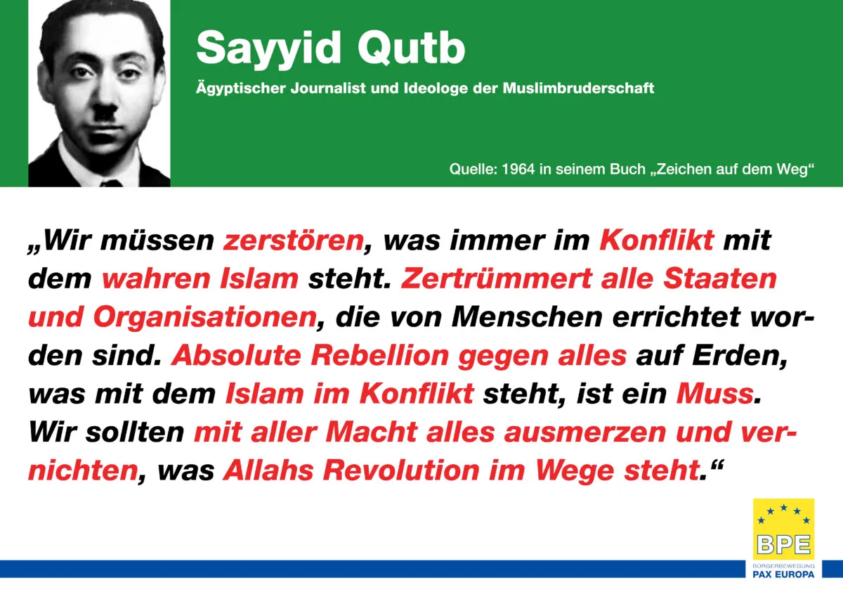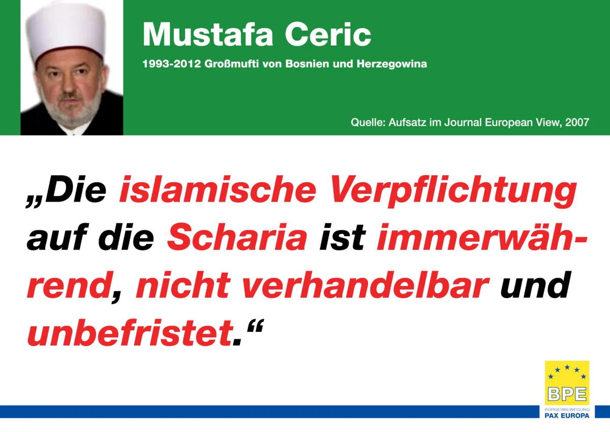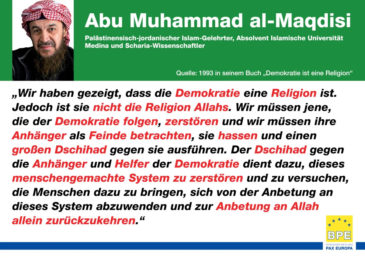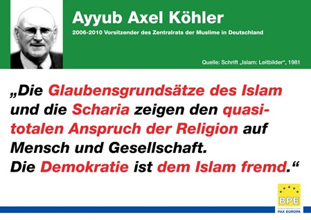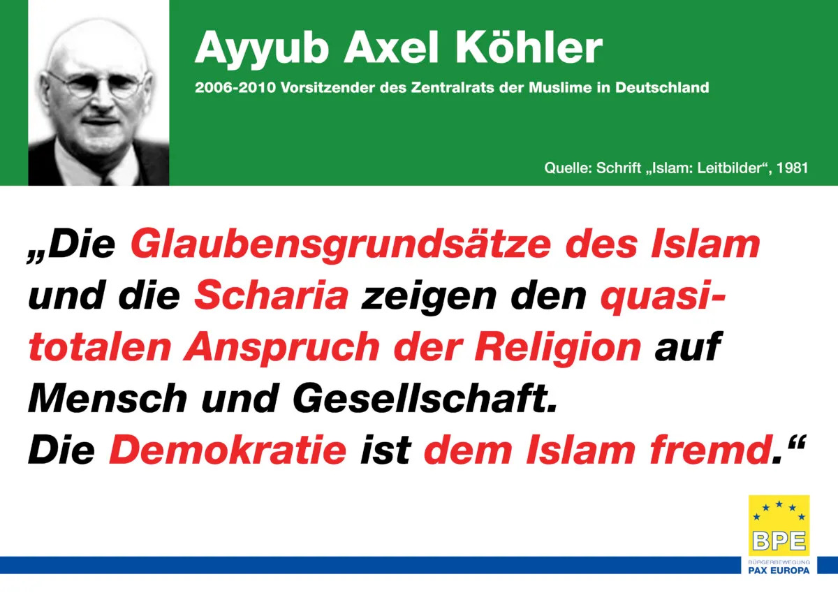 - „De Glaubensgrundsätze des Islams und die Scharia zeigen den quasi-totalen Anspruch der Religion auf Mensch und Gesellschaft. Die Demokratie ist dem Islam fremd.“