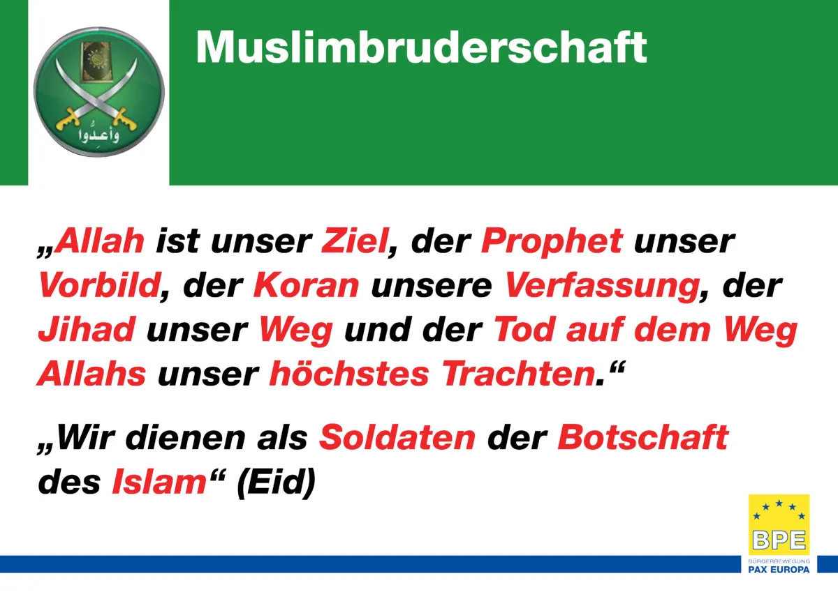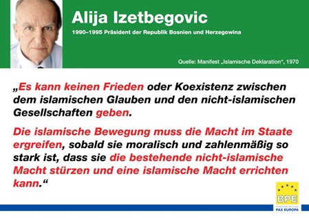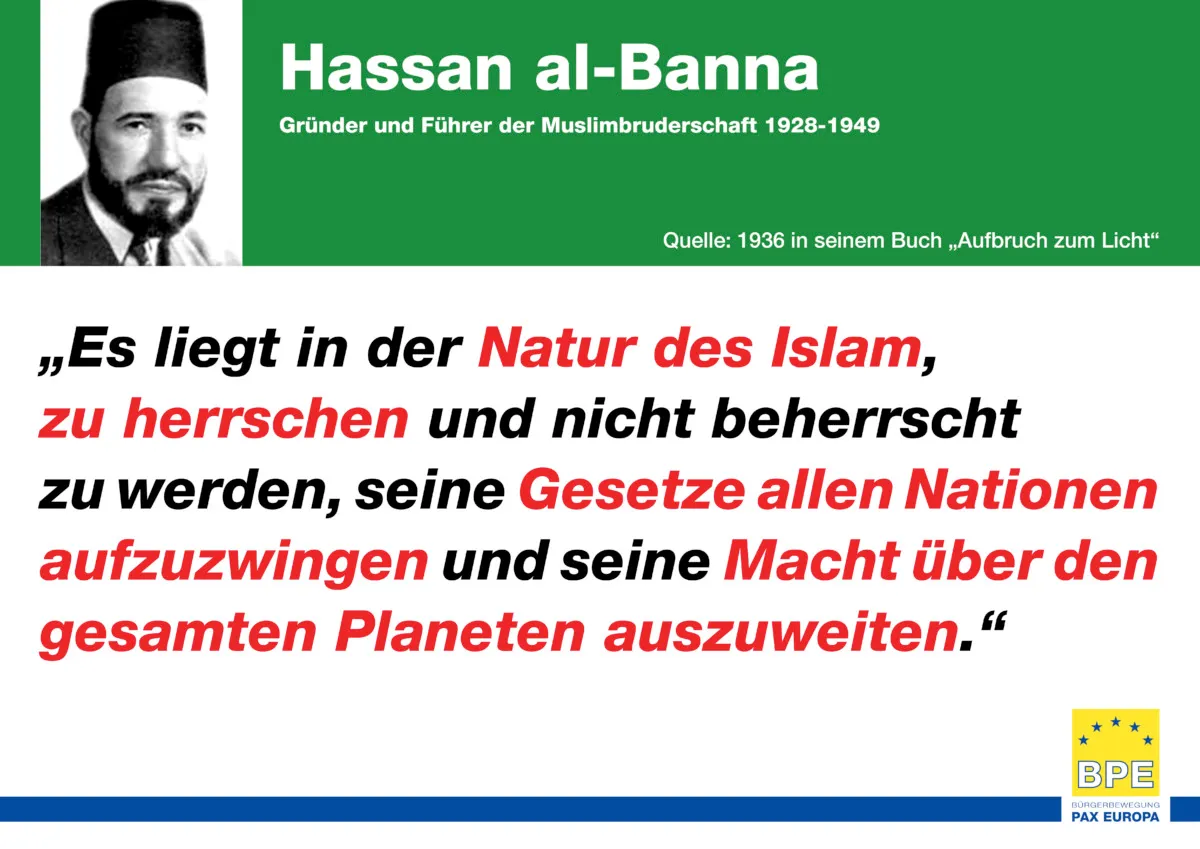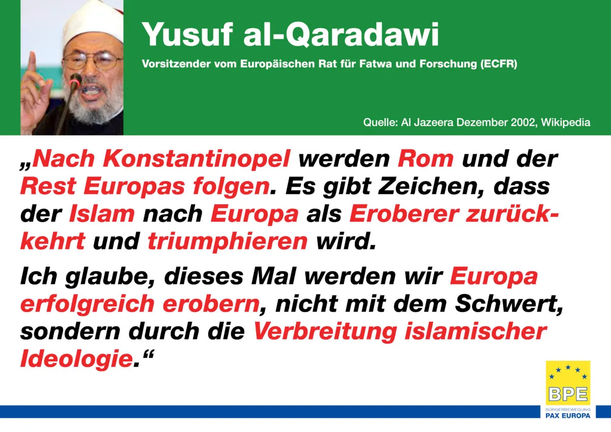 - „Unser Ziel ist es, auf dem europäischen Kontinent Wurzeln zu schlagen und dort in Ruhe und gemäß den Gesetzen zu leben, so dass eines Tages vielleicht ganz Europa muslimisch ist.“