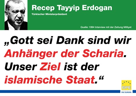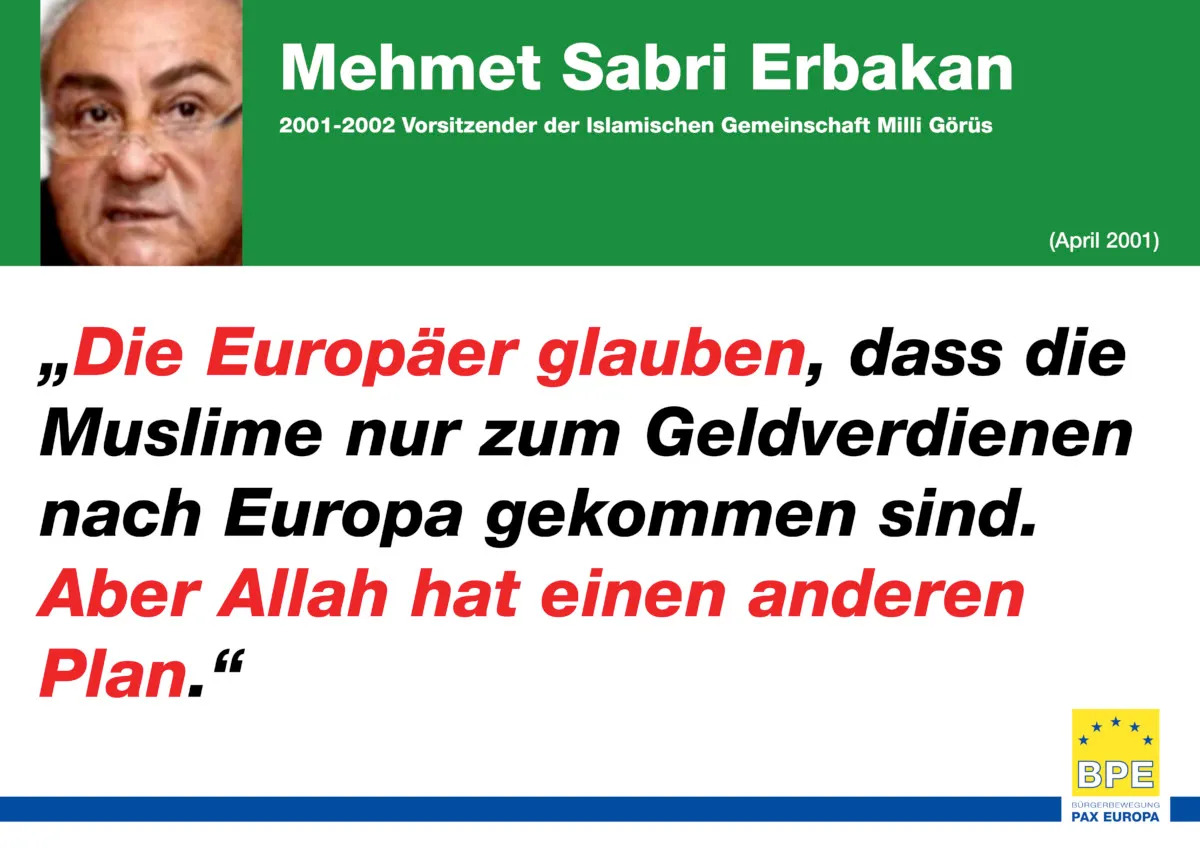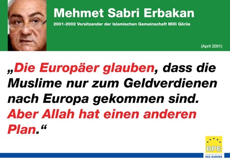 — Necmettin Erbakan, ehem. türk. Ministerpräsident, Buch: Mili Görüs - Nationale Weltsicht, 1973 - „Die Europäer glauben, daß die Muslime nur zum Geldverdienen nach Europa gekommen sind. Aber Allah hat einen anderen Plan.“