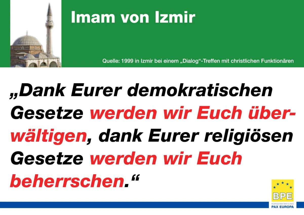 — Islamische Gemeinschaft Milli Görüs IGMG, Vorsitzender Mehmet Sabri Erbakan; April 2001, gem. bayer. „Verfassungsschutzbericht“ 2001, S. 147 - „Dank eurer demokratischen Gesetze werden wir euch überwältigen, dank eurer religiösen Gesetze werden wir euch beherrschen.“