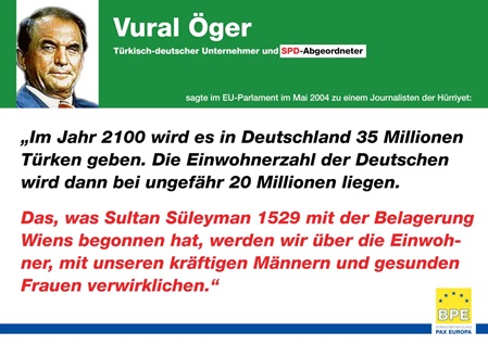 — Vural Öger, Vorzeige-Reisegeschäftsmann Öger Tours - „1683 sind die islamischen Heere des Osmanischen Reichs bis vor Wien gekommen. Und sie mussten unverrichteter Dinge wieder zurückkehren. Für mich steht fest, Gott schickt die Arbeiter ins Abendland, um den Islam zum Sieg zu führen. Deshalb würde die Rückkehr der islamischen Arbeitskräfte einem weiteren Rückzug aus dem Abendland gleichkommen.“ Bruder Abdullah