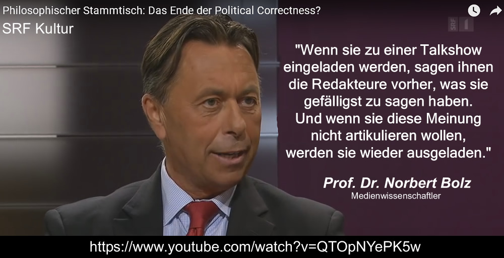 Detailiertere Inhalts-Übersicht ausklappen… Verkürzte Inhalts-Übersicht anzeigen…- Methoden der Lückenpresse (Begriff des Kommunikationwissenschaftlers Prof. Norbert Bolz, TU Berlin)
