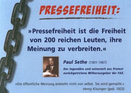 - „[...] Wer nun anders denkt, der hat auch nicht das Recht, seine Meinung auszudrücken? Die Verfassung gibt ihm das Recht, die ökonomische Wirklichkeit zerstört es. Frei ist, wer reich ist. Das ist nicht von Karl Marx, sondern von Paul Sethe. Aber richtig ist es trotzdem. Es enthält die Frucht der Erfahrung von 35 Journalistenjahren. Und da Journalisten nicht reich sind, sind sie auch nicht frei.“